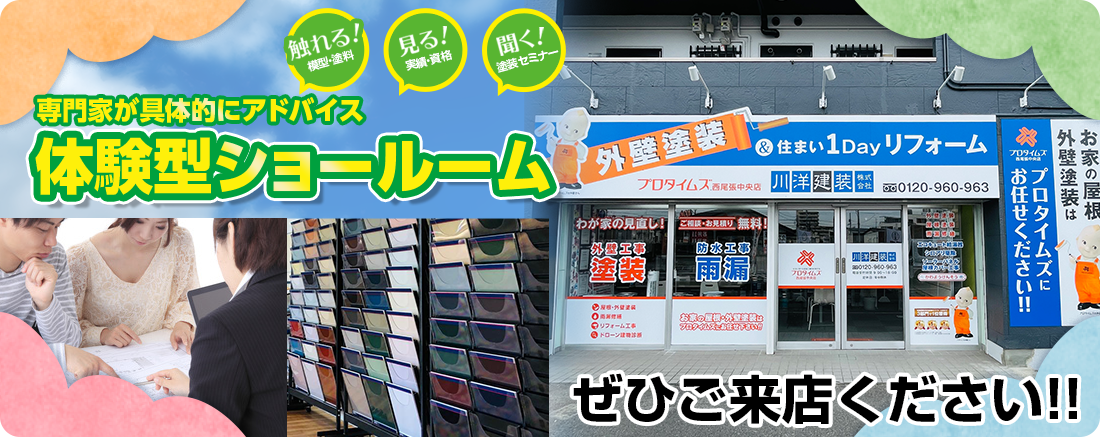 「どこの業者に外壁塗装を頼めばいいの?」 「どんな種類の塗料で施工をしてもらったらいいの?」そういったお客様の悩みを解決すべく、わかりやすく塗装のことを体験頂けるショールームを作っております。