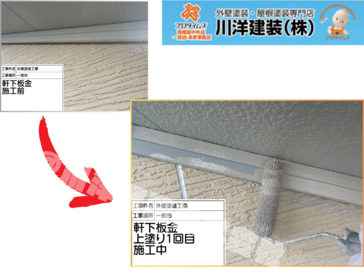 軒下板金は見えづらい部分ですが、その役割は非常に大きいです。しっかりと上塗り1回目を施すことで、外的要因から建物を守り、長期的に美しい外観を維持できます。意外と見逃しがちな箇所ですが、手を抜かずに丁寧に仕上げることで、全体の耐久性を大きく向上させる大事な作業です。
