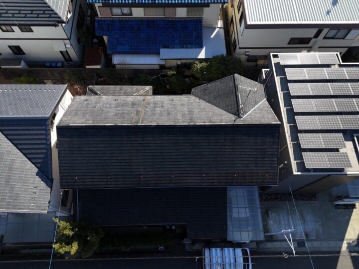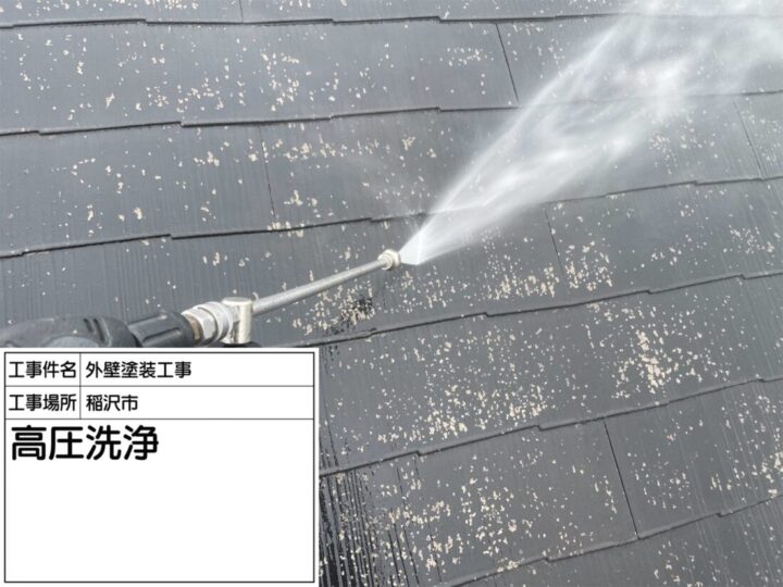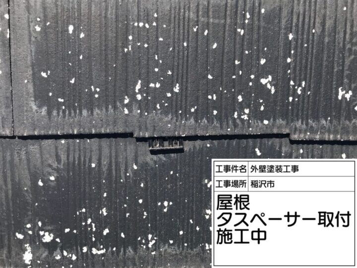 屋根全体に付着した汚れや旧塗膜、コケ、藻などを高圧洗浄機で徹底的に洗い流します。この工程により塗料の密着性が向上し、仕上がりと耐久性に大きく影響します。見えない部分まで丁寧に洗浄しました。タスペーサー設置施工