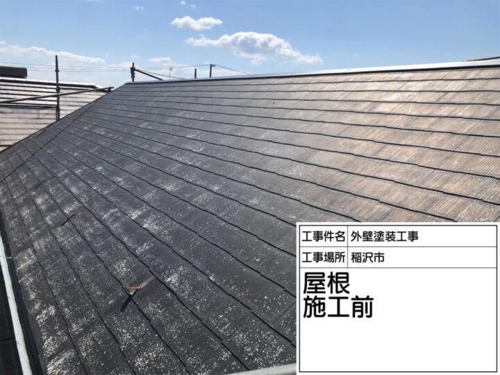 施工開始前の屋根の状態です。全体的に経年劣化が見られ、塗膜の剥がれやコケの発生が確認されました。これらを改善するため、丁寧な洗浄と塗装工程を順に行い、耐久性・防水性の高い屋根へと生まれ変わらせていきます。高圧洗浄