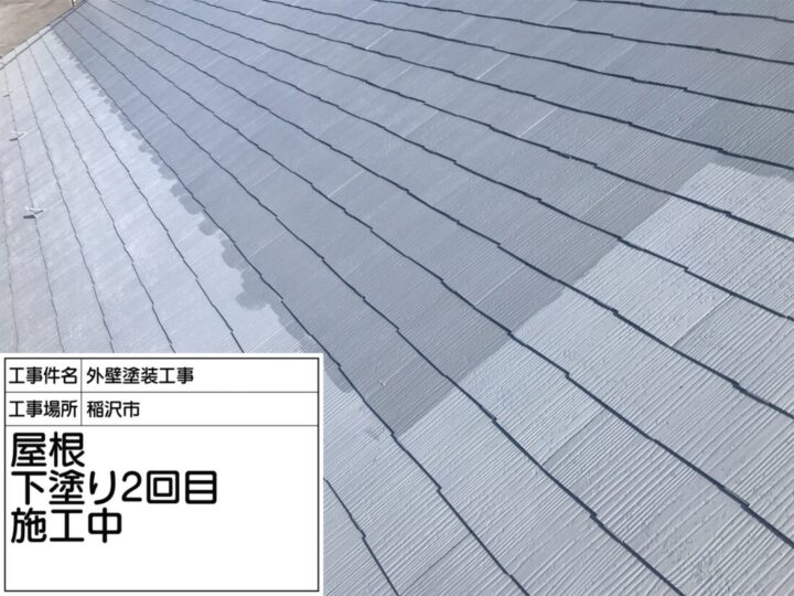 洗浄と下準備を終えた屋根に、下塗り1回目を施工しました。下地と塗料の密着性を高め、上塗りの発色や仕上がりを良くする重要な工程です。劣化が激しいため、吸い込みが多く感じられました。下塗り施工(2回目)