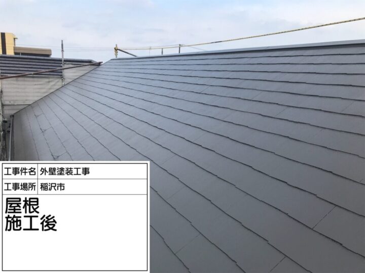 すべての工程を終え、屋根が美しく生まれ変わりました。塗膜にしっかりとした厚みとツヤがあり、防水性・耐久性ともに大きく向上。今後も長期間にわたって建物を守る役割を果たしてくれる仕上がりです。