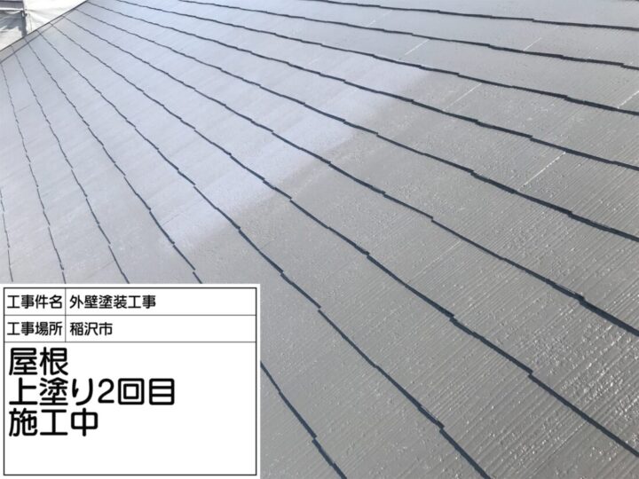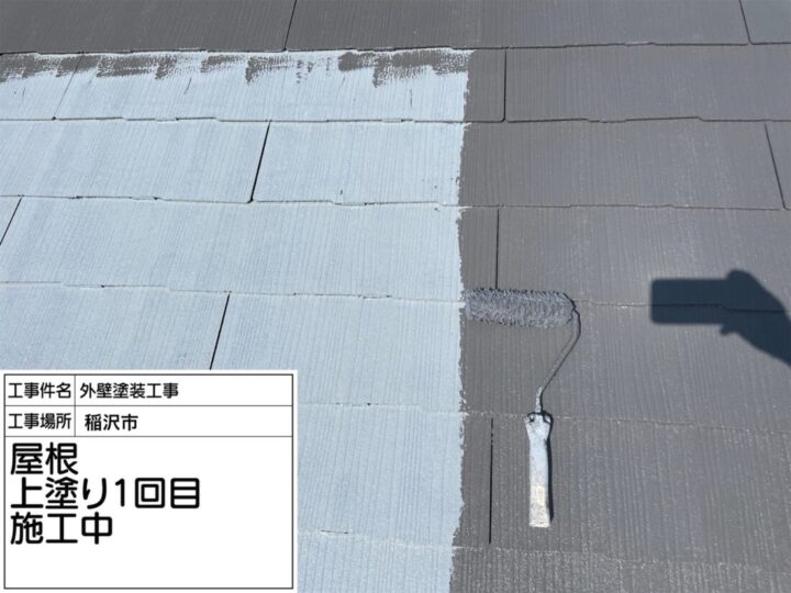 下地が整った屋根に、上塗りの1回目を施工しました。高耐候性塗料を使用し、美しい光沢としっかりした塗膜が形成されてきました。細部までローラーを使って均一に塗り込み、丁寧に仕上げています。上塗り2回目施工