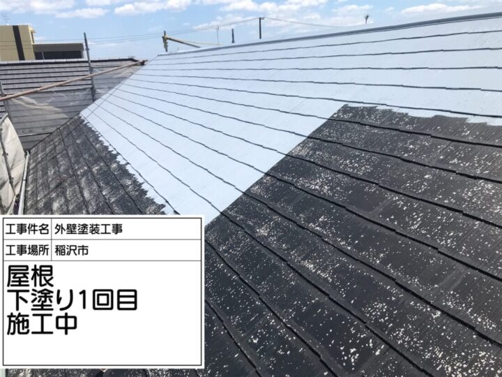 通気性と排水性を確保するため、屋根材の重なり部分にタスペーサーを取り付けました。これにより、雨水の逆流や内部の湿気がたまるのを防ぎ、屋根材の劣化を抑える効果が期待されます。重要な下準備の一つです。下塗り施工(1回目)