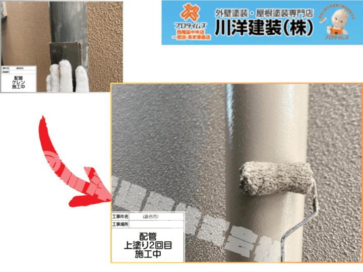 金属製の水切り部分には、まず防錆効果の高いサビ止め塗料を下塗りし、腐食を防止。その後、上塗り1回目を施工し、美観性と耐久性を高めます。細部まで丁寧に仕上げることで、長期にわたる耐候性能を実現します。配管塗装(上塗り2回目)