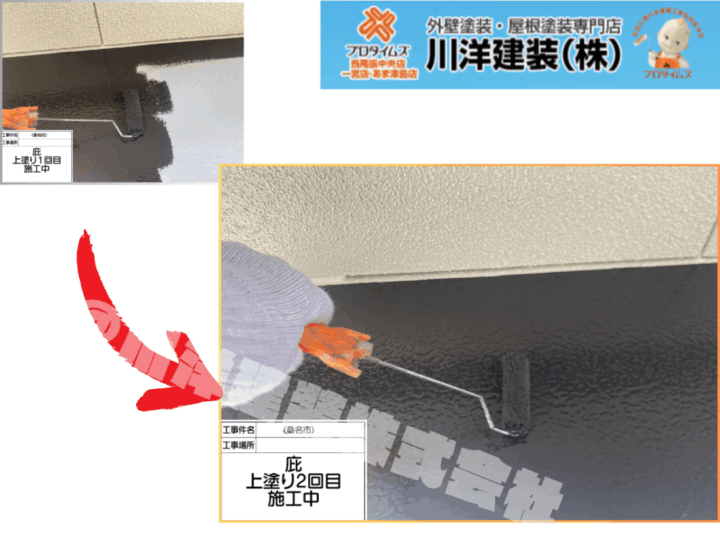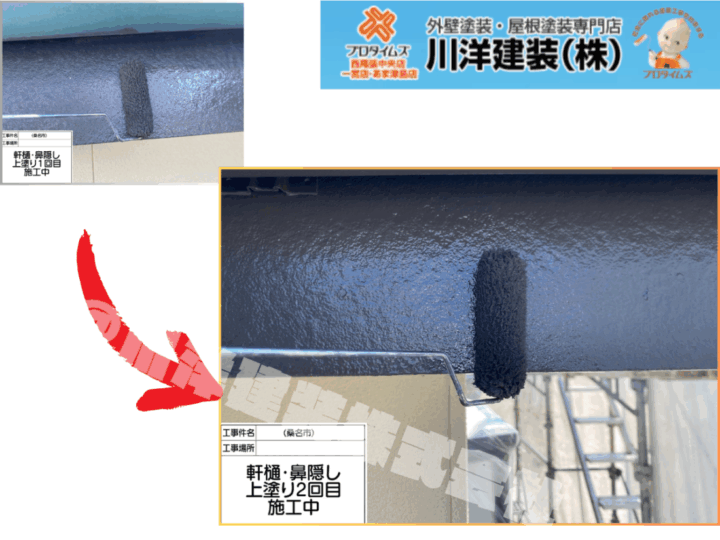 鼻隠しには、紫外線や風雨の影響を受けにくい高耐候塗料を採用。1回目の上塗りで下地を覆い、2回目で深みのあるツヤを出しつつ、塗膜を強化。美観と防水性を兼ね備えた、仕上がりの要です。庇塗装(上塗り2回目)