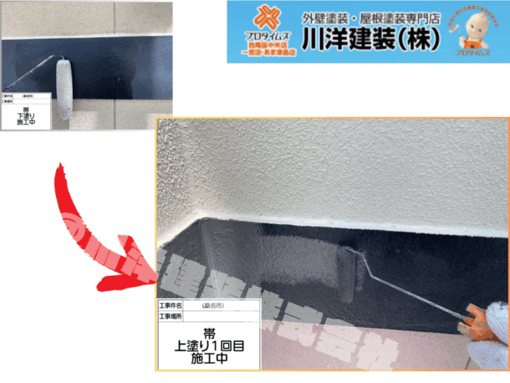外壁下地にシーラーを塗布し、塗料の密着力を高めた上で、フッ素REVO1000-IRを用いた上塗り1回目を実施。高い遮熱性能で夏の室内温度上昇を抑制し、美しさと快適性を両立した外壁に仕上げます。帯板塗装(上塗り1回目)