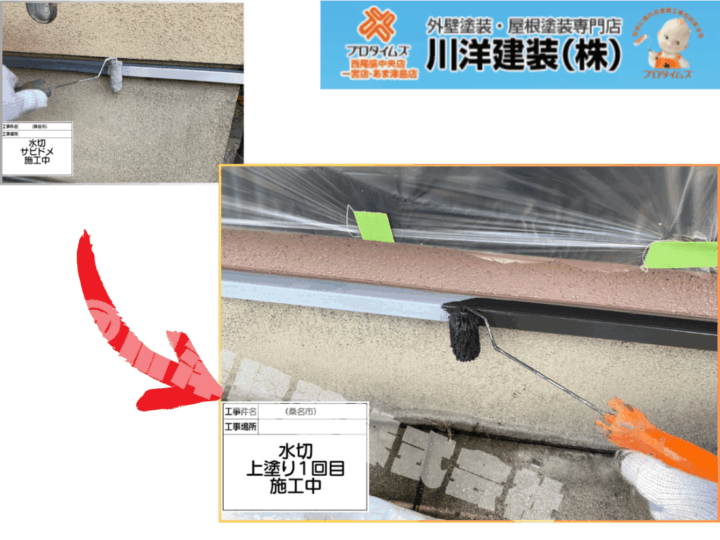 ベランダ床は、耐水性・防滑性に優れた専用塗料を使用。上塗り1回目で塗膜を形成し、2回目で厚みと強度を確保します。雨天や日射にさらされやすい部位のため、しっかりとした施工で劣化を防止します。基礎水切り板金塗装(上塗り1回目)
