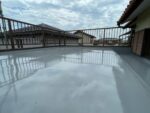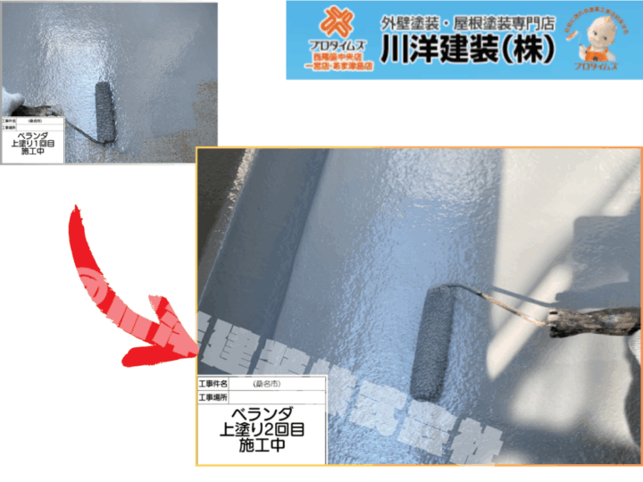 庇(ひさし)部分には、耐久性と防汚性を兼ね備えた塗料を使用。ローラーで均一に塗装し、1回目・2回目としっかり重ね塗りすることで、ツヤのある美しい仕上がりに。雨風にさらされる部分だからこそ、入念に保護します。ベランダ防水塗装(上塗り2回目)