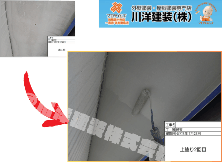 施工前はサビや汚れが目立っていた外壁。高圧洗浄と下地処理を丁寧に行った後、上塗り1回目を実施。ローラーを使って均一に塗料を塗布し、密着性と防水性を高めるよう配慮。建物全体の耐久性向上に繋がる重要な工程です。軒天塗装(上塗り2回目)