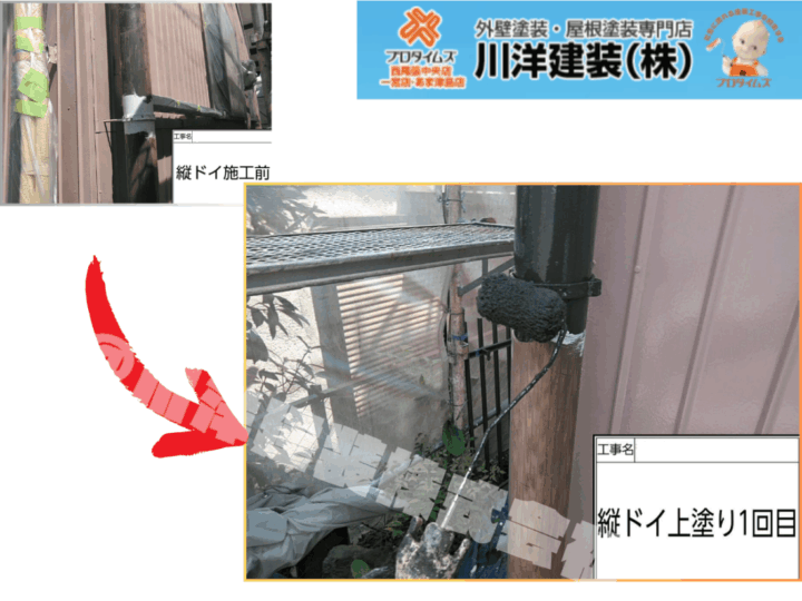 既存の竪樋は経年劣化により色褪せが進んでいました。下地処理をしっかりと行った後、ローラーを使って1回目の上塗りを丁寧に施工。塗料のムラが出ないように気を配りながら均一に塗布することで、美観と耐久性を両立しています。破風板塗装(上塗り1回目)