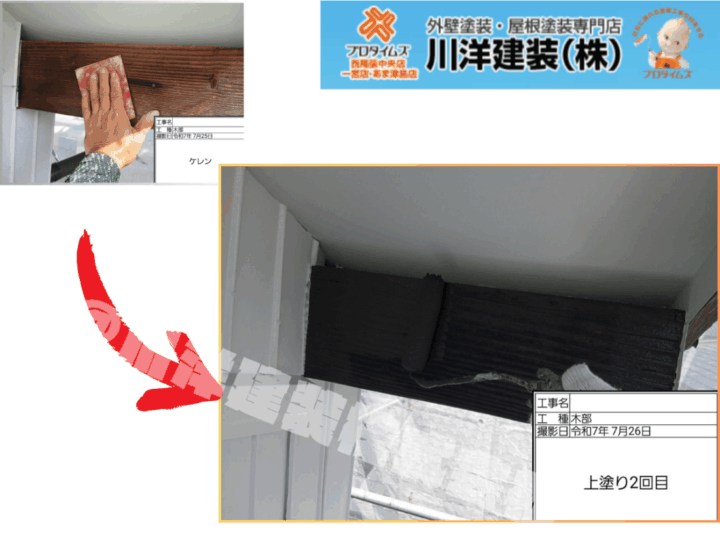 風雨に晒されやすい破風板は塗膜が劣化しており、木部の保護が必要な状態でした。破風板には、耐候性に優れた塗料を使用し、ローラーでしっかりと塗布。木目を活かしつつ、表面を保護するよう丁寧に作業を行いました。軒下木部塗装(上塗り2回目)