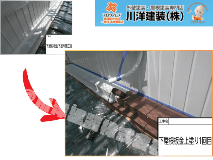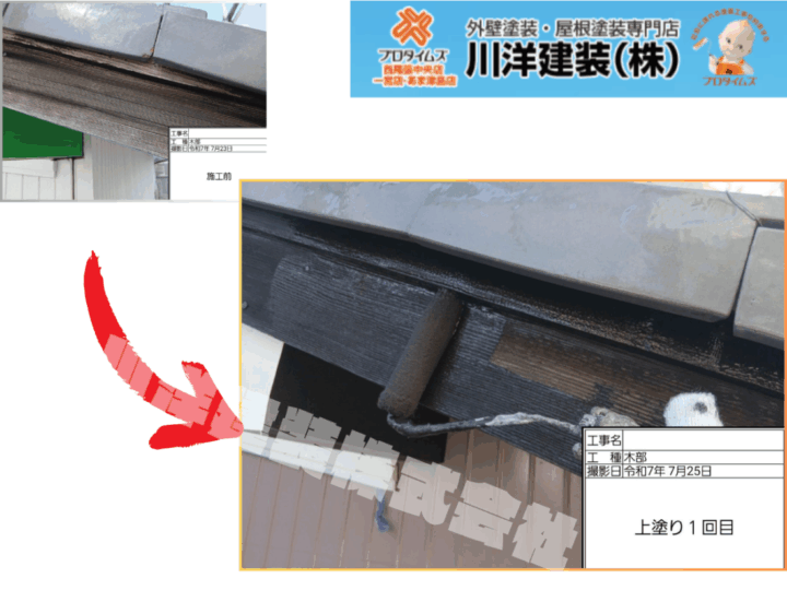 下屋根の板金部は色褪せが進み、サビの発生も見られました。下塗り後、上塗り1回目を実施。ローラーで塗料を丁寧に塗り込み、錆止め効果とともに美観を回復。防水性も高め、長期的な耐久性を意識した施工を行いました。