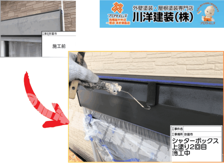 シャッターボックスは紫外線や風雨による劣化が起こりやすいため、上塗りを2回行い塗膜にしっかり厚みを持たせました。2回塗ることで耐久性と美観が向上し、長期間にわたり素材を保護します。艶のある美しい仕上がりに整えました。
