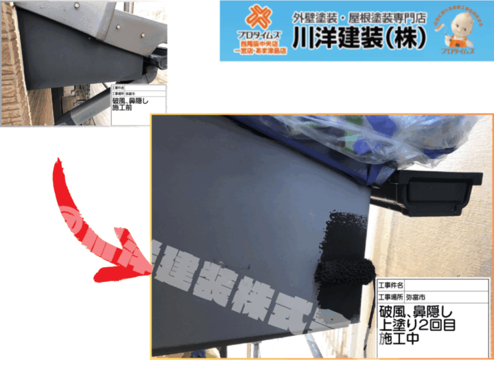 風雨にさらされやすい破風・鼻隠し部分には、上塗りの2回目を施工しました。2度塗りすることで塗膜がしっかりと厚くなり、耐候性・防水性が高まります。艶やかな見た目と長期的な保護効果を両立させるための大切な工程です。庇塗装(上塗り1回目)