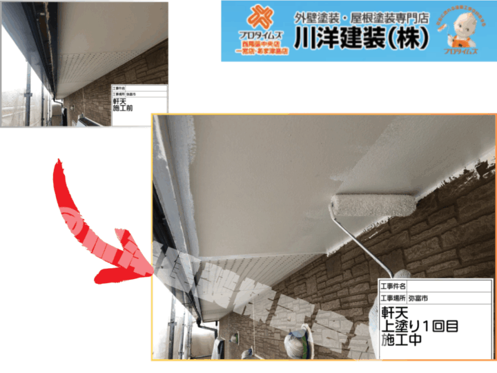 外壁に上塗り2回目を施工。1回目でできた細かな塗りムラや色ムラを補正しながら、塗膜に十分な厚みを持たせることで、防水性・耐候性がより一層強化されます。また、外観の印象が大きく変わるとともに、建物を雨風や紫外線から長期間守るための大切な工程です。軒天塗装(上塗り1回目)