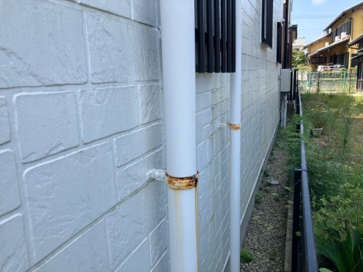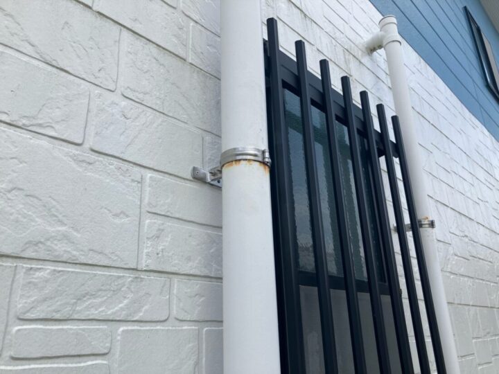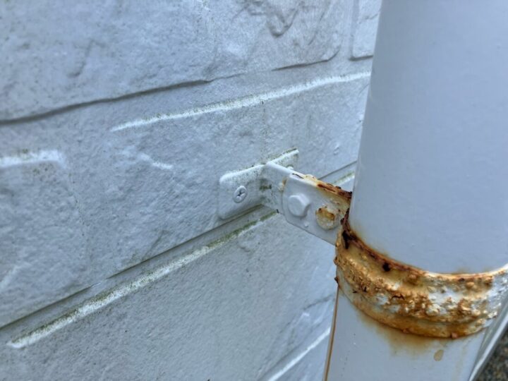 排水パイプを固定しているバンド部分に錆が発生しており、腐食が進行している状態でした。特に、金具の接合部には赤錆が広がり、強度低下が懸念される危険な状態でした。建物の外観にも影響を与えるため、早急な交換対応が必要と判断しました。今回の工事では、見た目と耐久性の両方を改善を目的とします。交換後