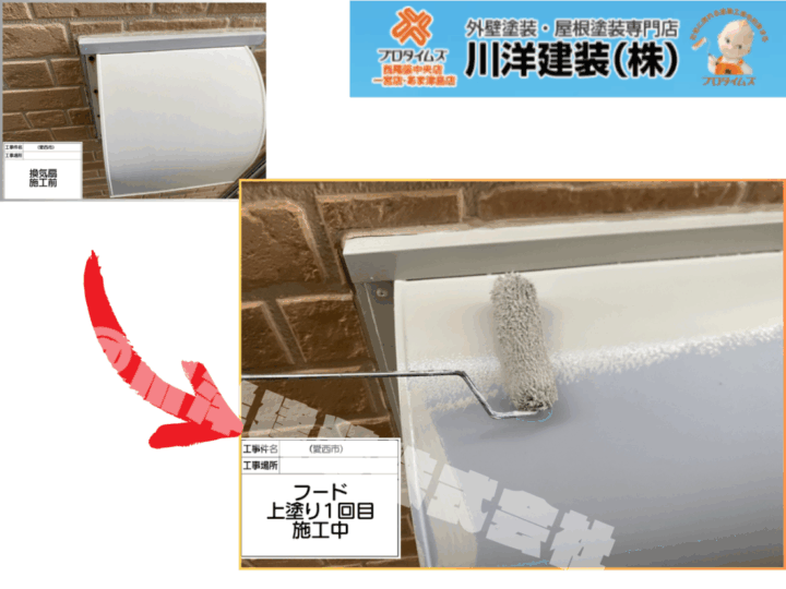 雨樋は紫外線や風雨にさらされ続けるため、塗膜が劣化しやすい部分です。上塗り2回目を丁寧に施工しました。塗料の密着を高め、均一で艶のある仕上がりとなるよう心がけています。外壁や付帯部と色を合わせることで、全体の統一感も意識した施工です。換気フード塗装(上塗り1回目)