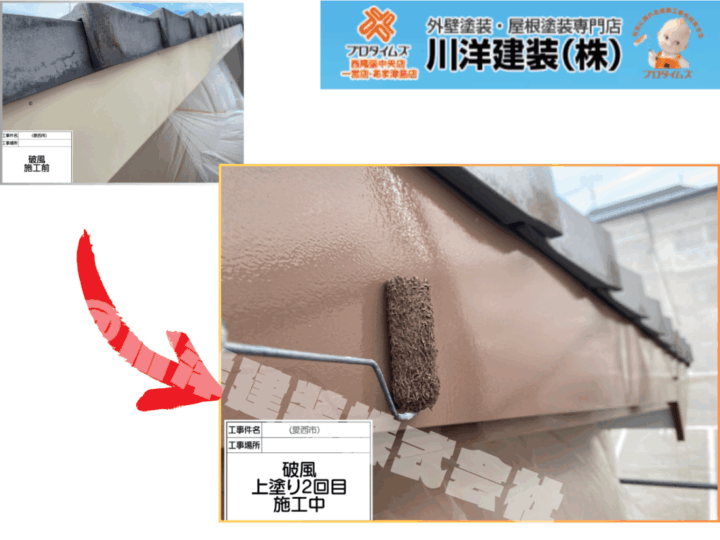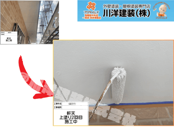 破風板は屋根まわりの見た目に大きく関わる部分であり、風雨の影響を受けやすい箇所です。下塗り・上塗り1回目を経て、上塗り2回目を実施しました。重ね塗りにより色ムラを防ぎ、光沢と塗膜厚を確保。耐久性・防水性を高めるだけでなく、建物全体の印象を引き締める仕上がりとなっています。軒天塗装(上塗り2回目)