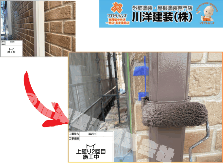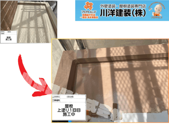 玄関まわりのポーチ屋根は、建物の顔となる部分であり、来訪者の目にも留まりやすい箇所です。下地処理後、上塗り1回目を丁寧に施工しました。耐候性と防水性を兼ね備えた塗料を使用し、艶のある美しい仕上がりを目指しています。屋根材の形状に合わせて、塗りムラが出ないよう慎重に塗布を行いました。