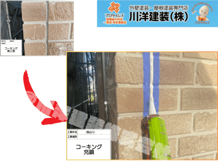 既存の劣化したシーリング材を撤去し、新たにコーキングを充填しました。雨水の侵入を防ぐ重要な工程であり、外壁の目地に沿ってしっかりと打ち直しています。両端には養生テープを貼り、施工後は均一に仕上げるためにヘラで丁寧に押さえています。防水性と耐久性を確保しました。外壁塗装(上塗り1回目)