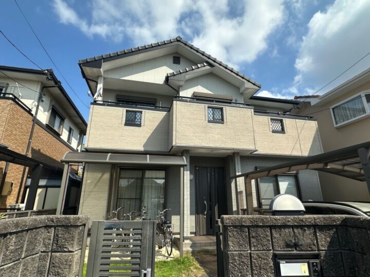 経年劣化により退色していた軒天部分に、上塗り1回目の塗装を行っています。塗装前に汚れや旧塗膜を丁寧に除去し、下地の状態を整えたうえで作業を進めました。紫外線の影響を受けやすい箇所のため、耐候性に優れた塗料を使用し、ローラーと刷毛を使い分けて細部まで均一に塗布しています。上塗り1回目でしっかりと塗膜を形成し、美観の回復とともに、今後の劣化を抑える下地づくりを丁寧に行っています。