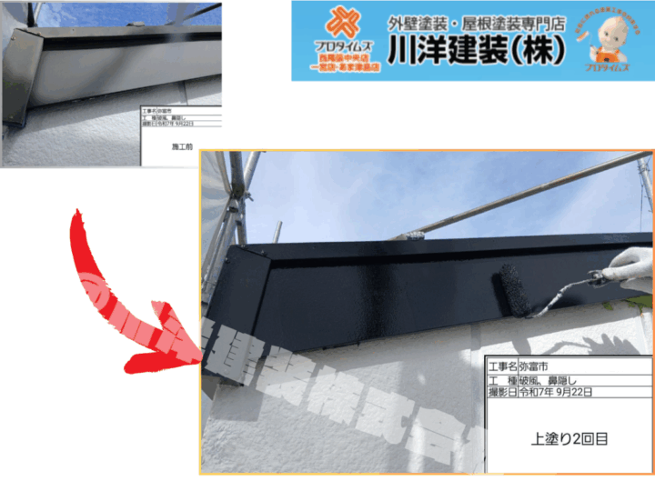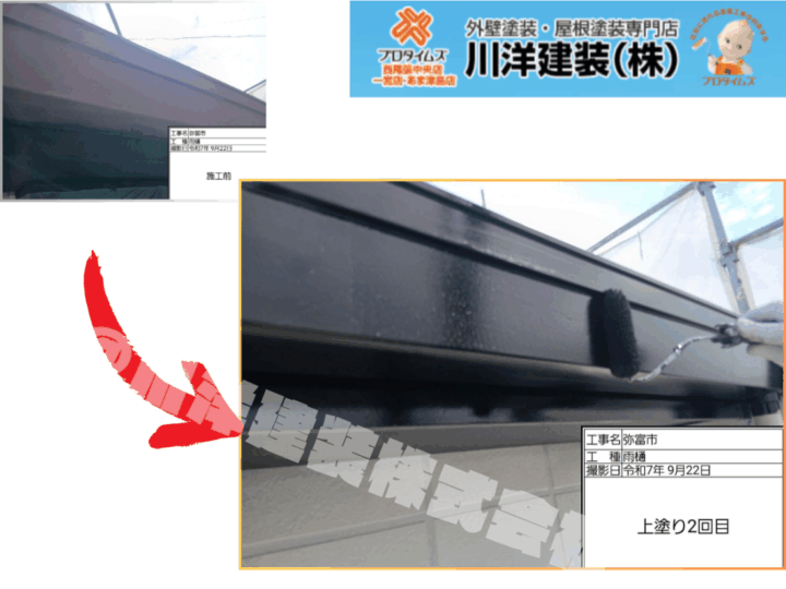 紫外線の影響で色あせが進行していた軒樋に、上塗り2回目の施工を行いました。劣化した旧塗膜は防水機能が低下しており、早期の塗り替えが必要な状態でした。1回目の上塗りでしっかりと塗膜を形成し、2回目では艶と厚みを均一に整えることで、美観と耐候性を高めています。細部まで丁寧にハケとローラーを使い分け、ムラのない滑らかな仕上がりに仕上げました。これにより防水性が回復し、紫外線や雨水から建物をしっかり保護できる状態となりました。
