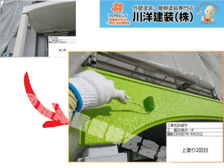 玄関ポーチ屋根の上塗り2回目を施工しました。今回は建物全体の雰囲気を明るくするため、アクセントとして黄緑系の色に塗り替えを行っています。1回目の上塗りでしっかりと塗膜を形成し、2回目では色ムラを整えながら艶と発色を高めました。細部まで均一に塗り込み、デザイン性と防水性を両立。これにより、玄関まわりがより華やかで温かみのある印象に仕上がりました。