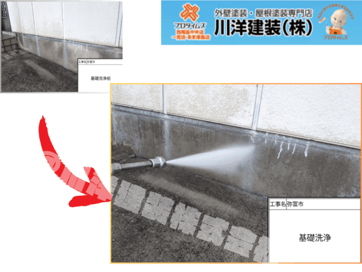 外壁全体に重度のチョーキングが見られたため、まずは高圧洗浄を丁寧に実施しました。長年の汚れや劣化した旧塗膜、粉状の塗料をしっかりと洗い流し、下地を清潔な状態に整えます。特に日当たりの強い面や雨だれ跡のある箇所は汚れが固着していたため、圧力やノズル角度を調整しながら念入りに洗浄を行いました。この工程を丁寧に行うことで、後の塗装の密着性が高まり、仕上がりと耐久性が大きく向上します。