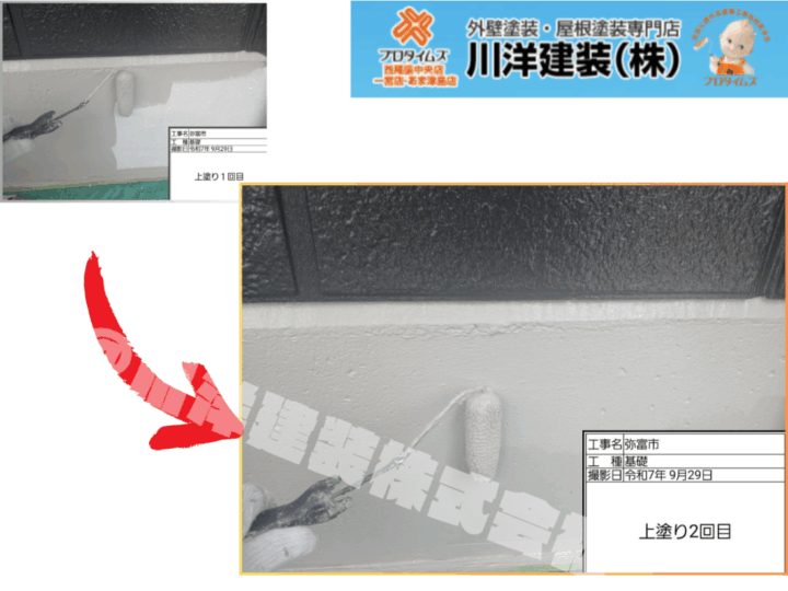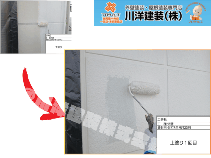 紫外線の影響で退色していた外壁に、上塗り1回目の施工を行いました。下塗りでしっかりと密着性を確保しているため、上塗り塗料がムラなく均一にのり、滑らかな仕上がりとなっています。塗料は耐候性・防汚性に優れたタイプを使用しており、今後の紫外線や雨水による劣化を防ぐ効果が期待できます。細部まで丁寧に塗り込み、美観と耐久性を両立させています。