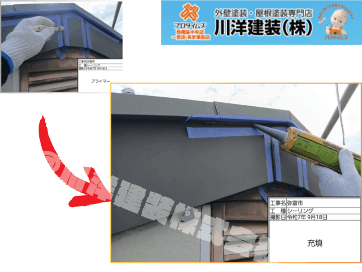 破風板のつなぎ目の既存シーリングは、経年劣化により硬化・ひび割れが見られました。そのため、古いシーリング材をすべて撤去し、清掃後にプライマーを塗布して新しいシーリング材を充填しました。特に破風板のつなぎ目は雨水の浸入リスクが高いため、気泡や隙間ができないよう均一に押さえ仕上げています。弾力性のある新しいシーリングにより、防水性と追従性が回復し、今後の外壁や木部の劣化防止にもつながります。