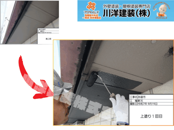 長年の紫外線や湿気の影響により退色していた軒天に、上塗り1回目の施工を行いました。軒天は外壁に比べて日陰になりやすい反面、湿気がこもりやすい部位です。退色していた部分も落ち着いた色合いを取り戻し、建物全体の印象をより明るく清潔に見せています。