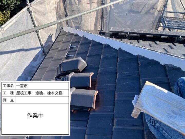 棟部に新しい漆喰を丁寧に充填し、瓦との密着性を高めた直後の様子です。古い漆喰をしっかり撤去したうえで、適切な厚みと均一な仕上がりになるよう慎重に施工しています。雨水の浸入防止と棟瓦の安定性向上を目的とし、後工程の棟瓦復旧に備えた重要な工程です。屋根全体の耐久性を高めるため、細部まで確認しながら作業を進めています。