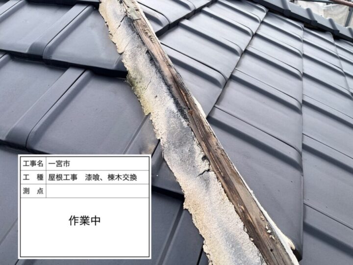 棟部の既存漆喰を撤去し、内部の棟木の状態を確認している作業途中の様子です。長年の風雨で傷んだ部分をしっかりと除去し、補修・交換に向けた下準備を進めています。撤去した後は新しい棟木を設置するため、寸法や固定位置の調整を行い、今後の棟瓦施工が確実に行えるよう丁寧に整えています。