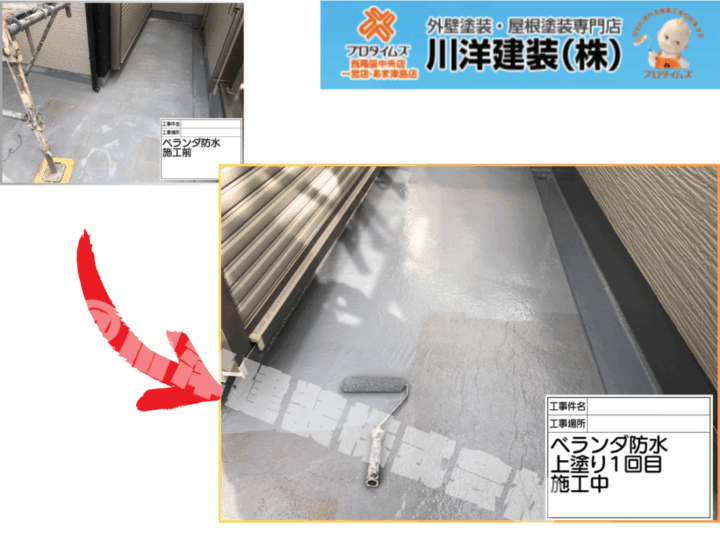 ベランダの床面は、建物内部への雨水の浸入を防ぐための重要な防水層です。既存の防水層に新しい防水塗料の上塗り1回目を行っています。ローラーで塗布しているこのグレーの塗料は、高い弾力性を持つトップコートであり、紫外線や摩耗から下層の防水層を保護する役割があります。これにより、ベランダの防水性能が完全に回復し、雨漏りの心配をすることがなく安心してご利用いただけるようになります。