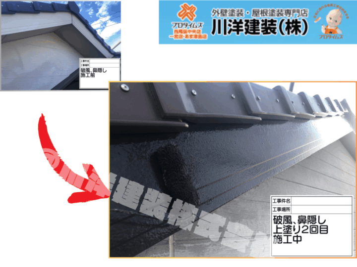 破風板は、屋根の先端部分にあり、雨風や紫外線から建物を守る重要な役割を担っています。この写真は、最終的な仕上げとなる上塗り2回目を行っている様子です。濃い色の塗料を塗布することで、外壁や屋根との色合いの調和を取り、建物全体を引き締めるアクセントとなります。また、上塗りを重ねることで、塗膜の耐久性が格段に向上し、腐食やひび割れを防ぎ、火災時の延焼防止にも貢献する保護性能を確保しています。