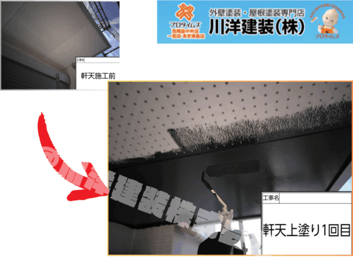 穴あきボードタイプの軒天に、上塗り1回目を行っている施工中の様子です。軒天は、延焼防止や屋根裏の換気という重要な役割を担っており、今回使用する塗料は、通気性を確保しつつも、防水性と防カビ性に特化したものを選定しています。濃い黒色の塗料をローラーで均一に塗布することで、外壁の色とのコントラストが生まれ、建物全体が引き締まったモダンな印象に仕上がります。この丁寧な塗装作業により、湿気によるシミやカビの発生を防ぎ、建物の耐久性を高めます。