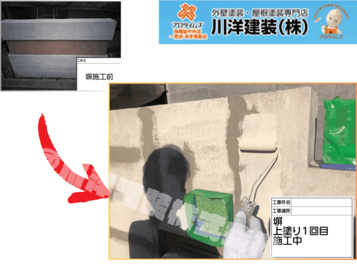 塀の上塗り1回目作業です。塀は地面からの湿気を吸い上げやすく、コケやカビが発生しやすい環境にあります。下塗りの工程前にクラックなどを補修した後、ローラーを用いて塗料を均一に塗布し、防水性と耐久性を高めています。明るいアイボリー系の色を選定することで、圧迫感を軽減し、敷地全体を明るく清潔感のある印象に仕上げます。この後、定められた乾燥時間を経て上塗り2回目を行い、最終的な仕上がりとなります。