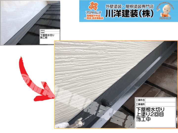 外壁と屋根の境目にある「水切り板金」は、雨水を適切に排水し、建物の下地への水の浸入を防ぐ、非常に重要な付帯部です。この写真は、水切り板金に、防錆性能に優れた塗料の上塗り2回目を行っている施工中の様子です。下地の色を消した後、仕上げとなる上塗りを重ねることで、塗膜の厚みを確保し、光沢のある美しい仕上がりになります。これにより、板金のサビの発生を防ぎ、長期間にわたり建物を雨水から守る高い防水性能を維持します。付帯部の細部まで手を抜かない丁寧な作業が、建物の寿命を延ばします。