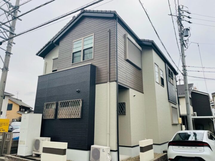 外壁塗装の下塗りを終え、いよいよ上塗り1回目の作業に入りました。塗りムラや塗り残しがないかをチェックしながら、均一な膜厚になるようにローラーで丁寧に塗布していきます。今回選定された深みのあるブラウンカラーは、建物の重厚感と高級感を演出します。この工程で塗膜の保護性能が発揮され始めますが、まだ仕上げではありません。この後、決められた乾燥時間を置いてから、さらに上塗り2回目を行い、最終的な耐久性と美しい仕上がりを目指します。