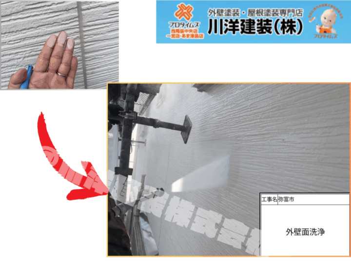 塗装工事の成否を決める最も重要な初期工程、高圧洗浄作業です。長年の排気ガス、泥汚れ、そしてカビやコケなどの微生物を高圧洗浄で徹底的に洗い落とします。特に、古い塗膜のチョーキング(粉状の劣化)もしっかり除去することで、次に塗る下塗り材が外壁材に深く浸透し、新しい塗料の密着性と耐久性を格段に高めることができます。この下地処理を怠ると、どんな高性能塗料を使用しても早期に剥離してしまうため、見えない部分こそ丁寧に、時間をかけて作業を行います。