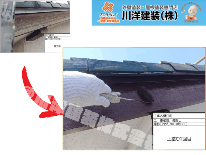 破風板と鼻隠しへの上塗り2回目(仕上げ)の作業です。この付帯部は、屋根裏への雨水の浸入を防ぐ最後の砦であり、耐火性も求められます。外壁には高性能なフッ素塗料を使用しているため、この破風板にも高耐候性の塗料を使い、耐久性を高めています。丁寧に塗り重ねることで、木部や金属部の腐食・劣化を防ぎ、光沢のある美しい仕上がりを実現します。建物の耐久性を総合的に高めるための、細部まで行き届いた重要な工程です。