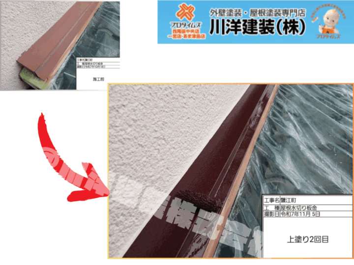 屋根と外壁の境界線にある水切り板金への上塗り2回目の塗装です。水切り板金は常に雨水にさらされるため、高耐候性かつサビに強い塗料を使用します。外壁のフッ素REVO1000-IRの高性能な塗膜を支えるため、付帯部にも耐久性の高い塗料を重ね塗りし、光沢のある美しい仕上がりを実現しています。この細かな付帯部の塗装まで手を抜かないことが、雨水の浸入を防ぎ、建物の寿命を延ばすためのプロの仕事です。