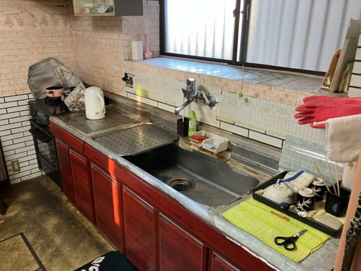 施工前のキッチンは、長年の使用による油汚れや水垢が全体に付着しており、特にシンク周りやタイル部分には黒ずみや黄ばみが目立っていました。壁面には銀テープが残っており、劣化による粘着汚れも確認できる状態でした。日常清掃では落としきれない汚れが蓄積していました。