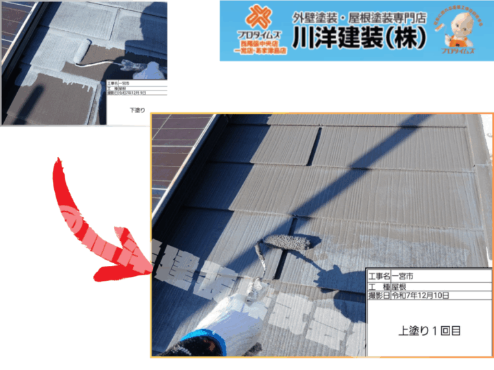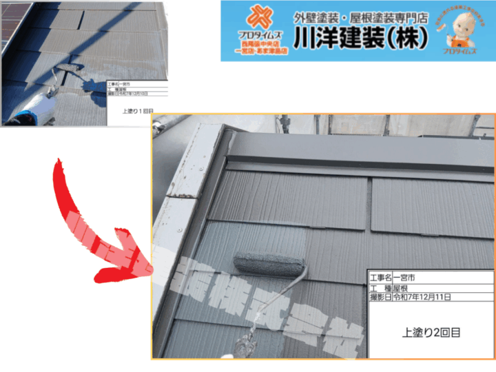 上塗り2回目は、1回目で形成した塗膜をさらに強化する仕上げ工程です。「超低汚染リファイン500MF-IR」を重ね塗りすることで、艶・美観が向上し、遮熱性・耐久性も最大限に発揮されます。塗り継ぎや厚みを確認しながら丁寧に施工し、長期間安心してお住まいいただける屋根に仕上げました。