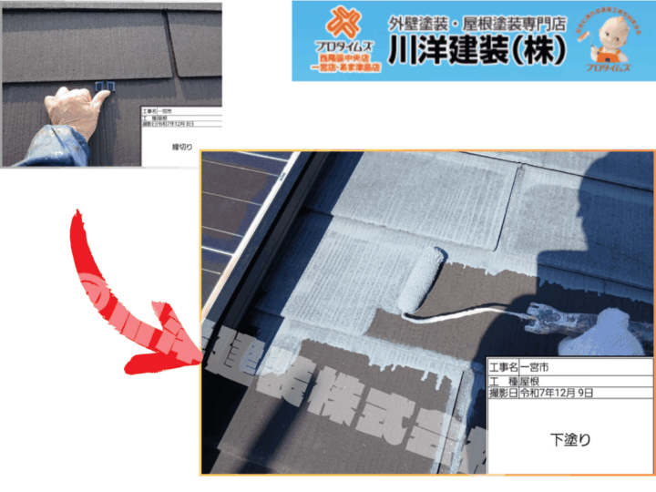下塗りには、セメント瓦専用遮熱下塗り材「アステックペイント サーモテックシーラー」を使用しました。屋根材への浸透性に優れ、劣化した下地を補強しながら上塗り材との密着性を高めます。また遮熱効果により、屋根表面温度の上昇を抑制。塗りムラや塗り残しが出ないよう、ローラーと刷毛を使い分け丁寧に施工しました。
