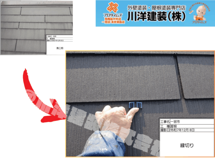塗装前に、屋根材同士の重なり部分へタスペーサーを適切に設置しました。セメント瓦は塗膜で隙間が塞がれると雨水の排出が妨げられ、雨漏りや下地劣化の原因となります。タスペーサーを均等に挿入することで通気性・排水性を確保し、屋根本来の性能を回復させました。見えない部分ですが、耐久性を高める重要な工程です。