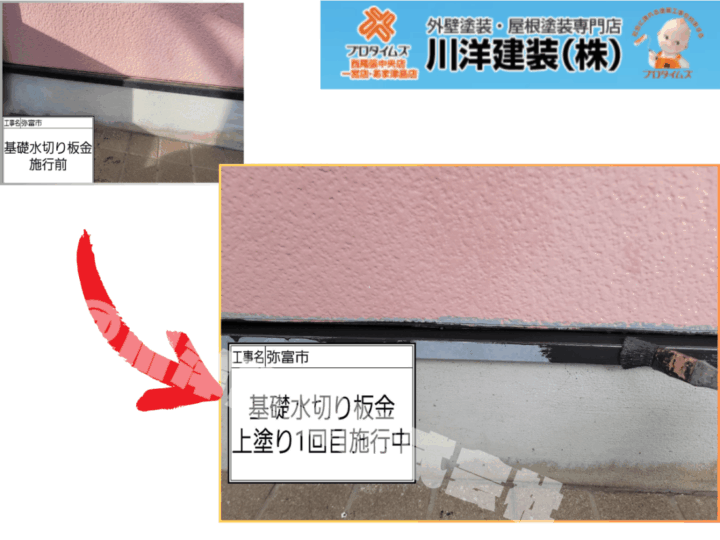 基礎水切り板金の上塗り1回目を行いました。マックスシールドを使用し、塗りムラや塗り残しが出ないよう丁寧に塗布。刷毛で細部までしっかり塗装し、均一な塗膜を形成しています。下地の状態を確認しながら施工することで、耐久性と美観を高め、建物全体の印象を引き締める重要な工程です。