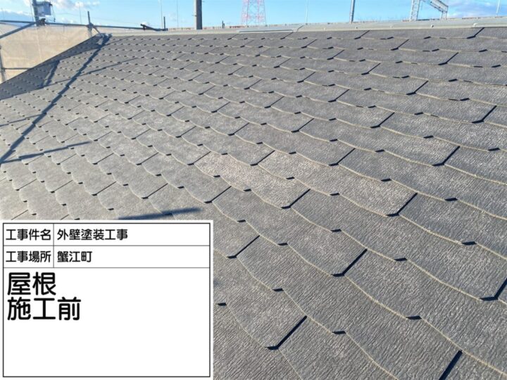 工事着手前の屋根の状況を撮影しました。色あせや汚れ、コケの付着が見られました。今後の塗装工程に向け、足場や養生の確認を行い、安全で丁寧な施工を計画しています。まずは現状の記録として写真を保存し、施工前の状態をしっかりと把握します。