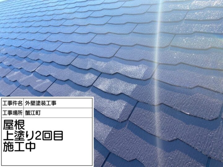 上塗り2回目として「セミフロンスーパールーフⅡ」を塗布し、仕上げの塗装を行っています。1回目で塗布した塗膜の厚みを均一に整え、耐久性と美観をさらに向上させる工程です。ローラーや刷毛で丁寧に塗り広げ、塗り残しやムラがないよう確認しながら施工しています。写真では屋根全体に均一な光沢が現れ、完成に向けた最終段階であることがわかります。